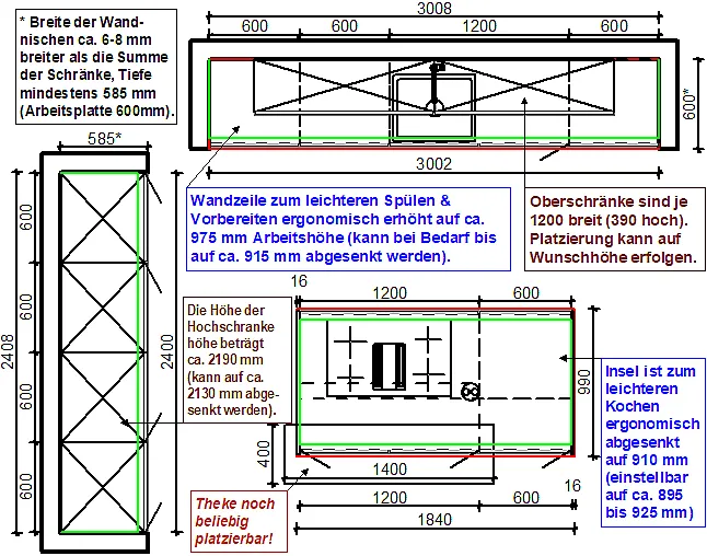 Die Küche ist recht flexibel aufstellbar: Die Hochschränke können beliebig aufgeteilt werden, die Spülzeile kann auf Wunsch um 60 cm gekürzt werden (Arbeitsplatte würden wir schneiden) und die Insel kann sowohl frei stehen als auch als "Halbinsel" mit einer der kurzen Seiten direkt an einer Wand andocken. Details zu den Maßen finden Sie weiter unten im Text und auf der Grundrisszeichnung, die wir als letztes Foto mit hochgeladen haben.