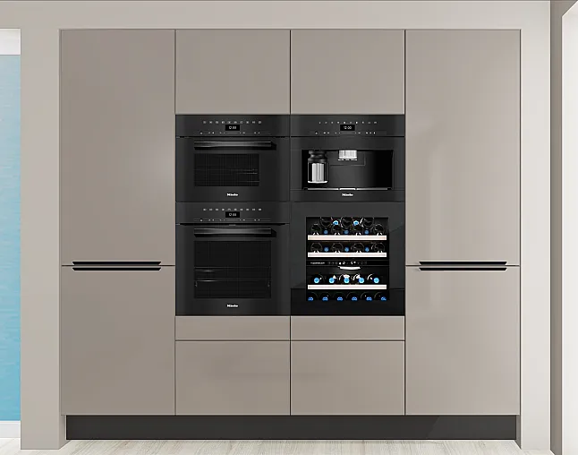Die Hochschränke können flexibel angeordnet werden und sind hier als 2,40 m lange Hochschrankwand gezeigt. Sie können z. B. auch auf verschiedene Wände aufgeteilt werden, neben dem Ende der Wand-Arbeitsplatte oder auch völlig frei an einer oder mehreren Wänden stehen. Ggf. benötigte Seitensockel werden mitgeliefert. Im linken Hochschrank ist oben das ausziehbare und arretierbare Tablar mit den drei eingebauten Steckdosen eingeplant; darüber befinden sich noch drei auf flexiblen Höhen positionierbare Ablageböden, hinter der unteren Tür gibt es außerdem in diesem Schrank noch zwei Innenschubladen. Die Schubladen und Türen in den beiden Geräteschränken von Dampfgarer/Mikrowellen-Kombi und Pyrolyse/Klimagaren-Backofen links sowie von Kaffeemaschine und Weinkühler rechts sind mit Tip-On-Beschlägen ausgestattet und die Fronten dieser Schränke auf Maß passend zu den Geräten gefertigt, so dass sich eine besonders ruhige Optik ohne die häufig üblichen Ausgleichsblenden ergibt. Das große Kühlzentrum befindet sich in dem rechten Hochschrank und öffnet immer nach rechts. Der von Schüller passend gefertigte Schrank verfügt über eine verdeckt integrierte und somit "unsichtbare" passive Belüftung für den Kühlschrank, so dass kein optisch störendes Lüftungsgitter die aufgeräumte Optik stört. Gleiches gilt auch beim Schrank mit dem sichtbar eingebauten 2-Zonen-Weinkühler, der mit seiner LED-Beleuchtung Ihre Lieblingsflaschen chic präsentiert und ein unaufdringliches optisches Highlight ist!