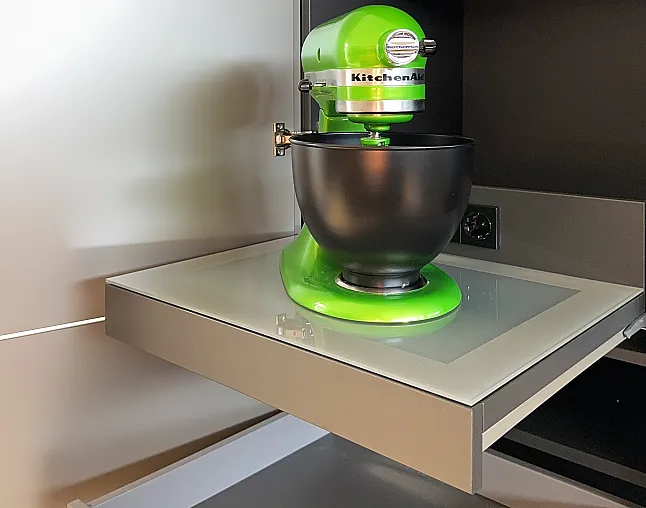 - 20 ausziehbaren Elementen wie Auszügen und Schubladen - und dem genialen, im ausgezogenen Zustand arretierbaren Tablar zum Einbau im linken Hochschrank, in stabiler Ausführung und mit leicht zu reinigendem Glasboden sowie mit drei werksseitig eingebauten Steckdosen. Dieses Tablar dient zur Unterbringung und zum Betrieb z.B. von Küchenmaschine und Toaster, und es kann wie ein zusätzliches Stück Arbeitsfläche betrachtet werden, das man bei Bedarf hervorzaubert und wieder verschwinden lassen kann (siehe das Foto dazu in der Fotoreihe)!