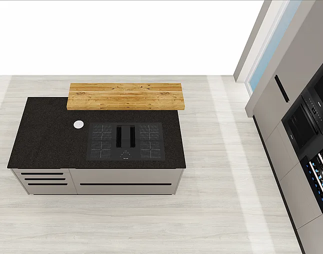 Die Insel ist 184 x 99 cm groß. Unterhalb des Kochfeldes befinden sich zwei Auszüge, die z.B. oben für Pfannen und unten für hohe Töpfe genutzt werden können. Links daneben sind drei (!) Schubladen oben vorgesehen, von denen auch gleich zwei mit Eiche-Einsätzen für Kochutensilien und Besteck bestückt sind; unten ist ebenfalls noch ein hoher Auszug untergebracht, z.B. für Ölflaschen und Schüsseln. Auf der Inselrückseite finden sich zwei Schränke (einer davon mit Doppeltür), deren bei dieser Küche bewusst reduzierte Tiefe zwar nicht mehr sinnvoll für Auszüge reicht, die aber auf jeweils drei Abstellebenen reichlich Platz für Tassen, Vasen etc. und bis zu 32 cm tiefe Teller bieten (und natürlich für das Raclette-Gerät im Karton, das nur 1x im Jahr herausgeholt wird)! Durch diese reduzierte Tiefe nimmt die Insel weniger Raum ein und kann flexibler gestellt werden. Die bewusst versetzte Anordnung des Kochfelds bewirkt dabei, dass es dennoch ein schönes zusammenhängendes Stück Arbeitsfläche an einer Seite des Kochfeldes gibt - statt zweier gleich kleiner Abschnitte an beiden Seiten des Kochfeldes, die bei dieser reduzierten Tiefe jedoch nicht mehr so gut nutzbar wären. So bleibt hier dank dieser durchdachten Planung links vom Kochfeld genug Platz für Kochvorbereitungen auf der Arbeitsfläche und richtige 60 cm breite Schubladen! Und die umlaufende Sockelleiste verleiht der Insel zu guter Letzt eine gewisse "schwebende" Optik.