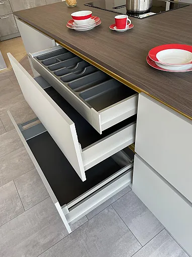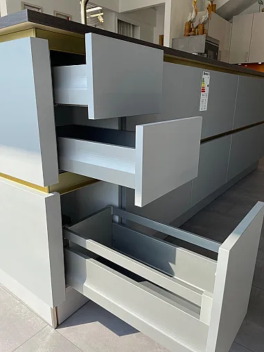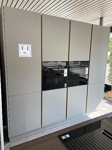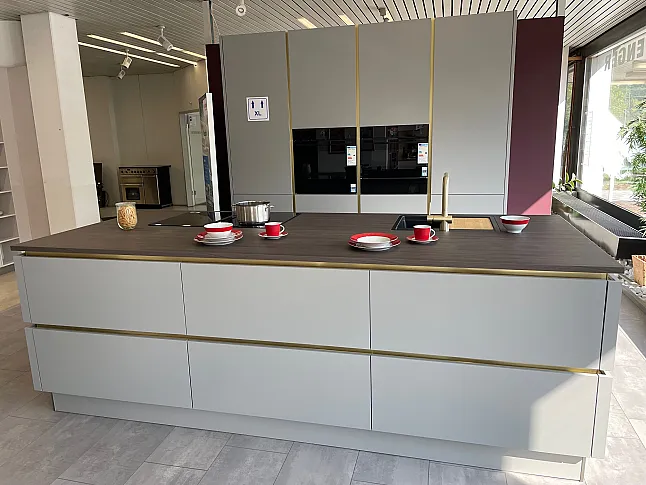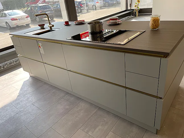Erleben Sie die grifflose Häcker Musterküche Top Soft-GL in elegantem Perlgrau, ein Designstück, das modernes Design und funktionale Exzellenz vereint. Die matte Lackfront strahlt zeitlose Eleganz aus, veredelt durch stilvolle goldene Griffleisten, die jedem Raum eine besondere Note verleihen.