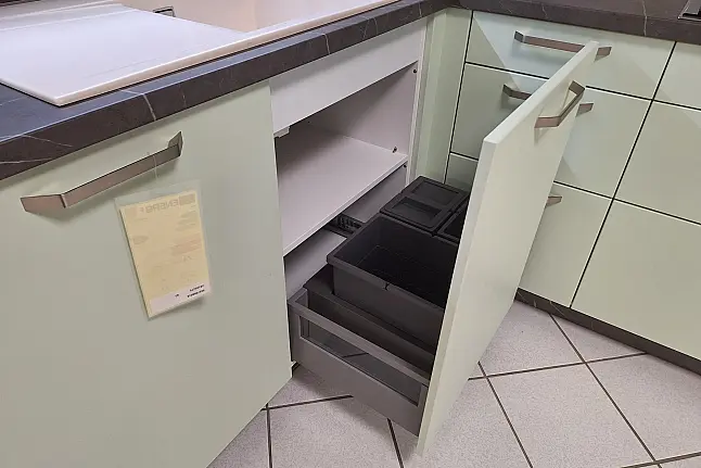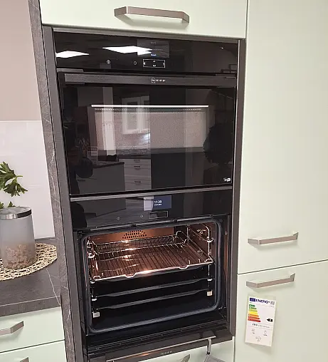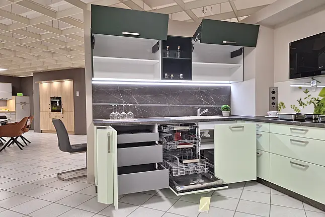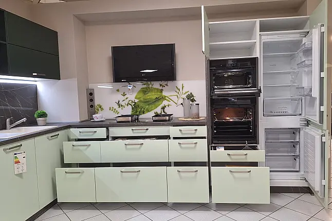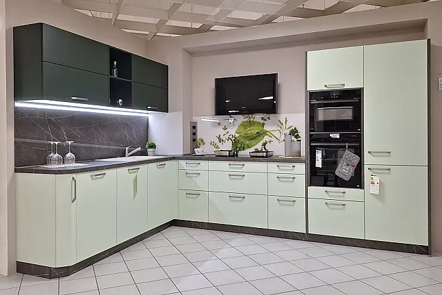 Musterküche Biella in Pastellgrün Gloss von Schüller inkl. Neff Elektrogeräte und Spüle (wie unten beschrieben).