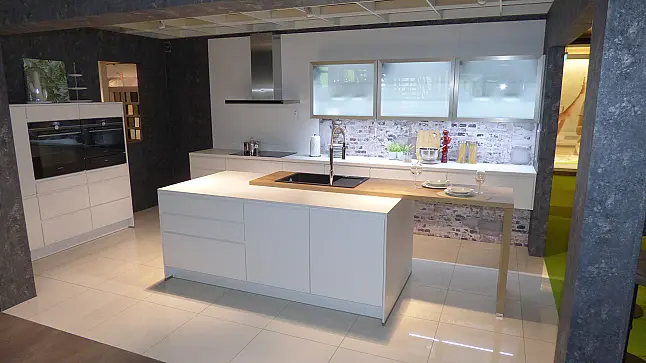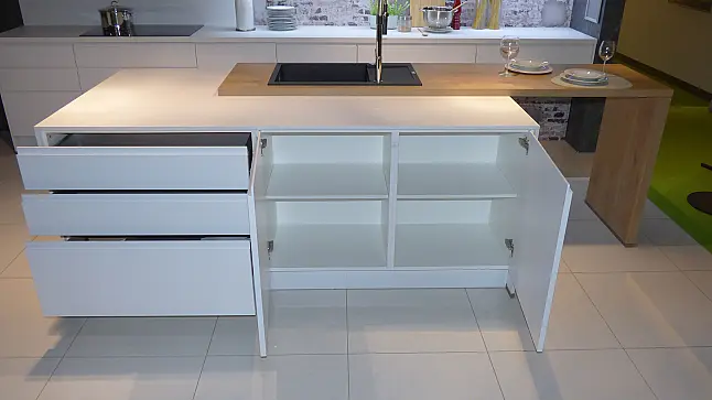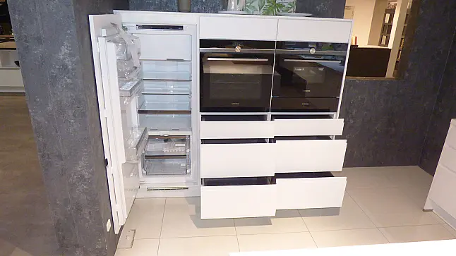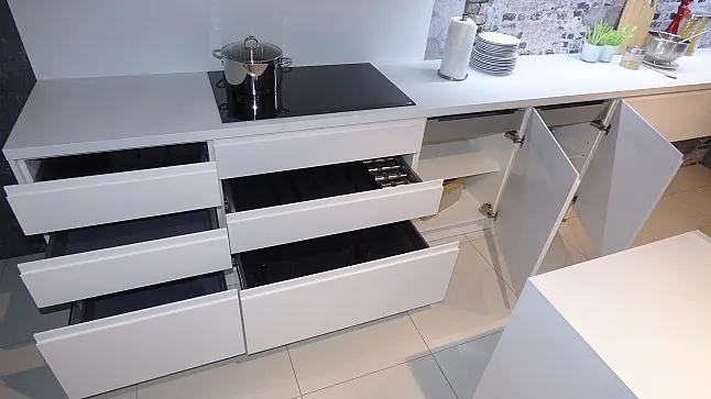 Mit alpinweißen Lackfronten und alpinweißenfügt sich die grifflose Ausstellungsküche hervorragend in viele Wohnkonzept ein.