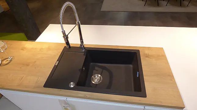 Weiterhin ist eine hochwertige Granit-Einbauspüle mit Armatur in der Küche mit Einbaugeräten enthalten.
