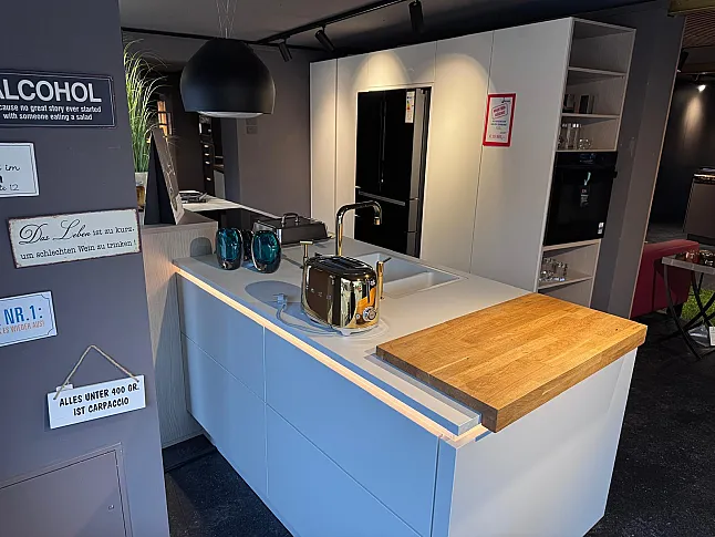 Nolte Neo - MatrixOne - Softlack 76W weiß Grifflose Kücheninsel Mattlack weiß mit viel Stauraum und XXL Standkühlschrank