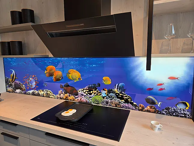 Die oberen und unteren Schränke der linken Seite, sowie die Regalbretter auf der rechten Seite, sind mit einer hellen Holzoptik ausgestattet. Die Unterschränke der Küchenzeilen haben einen matten Grauton. Die Griffe, Regalleisten und andere Details der Küche sind schwarz. Über die rechte Zeile streckt sich ein etwa 2 Meter langes, gläsernes, farbenfrohes Abbild eines Riffs. Das Design der Küche ist klar und zeitlos, jedoch hat es ebenso einen modernen Touch.