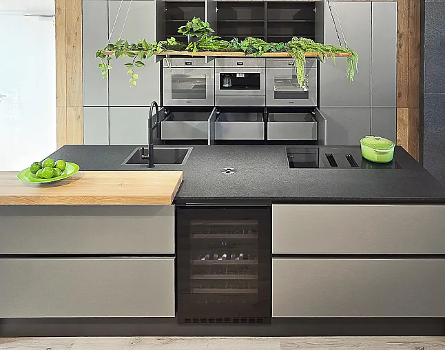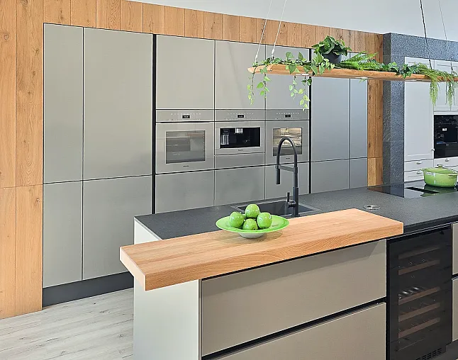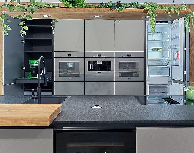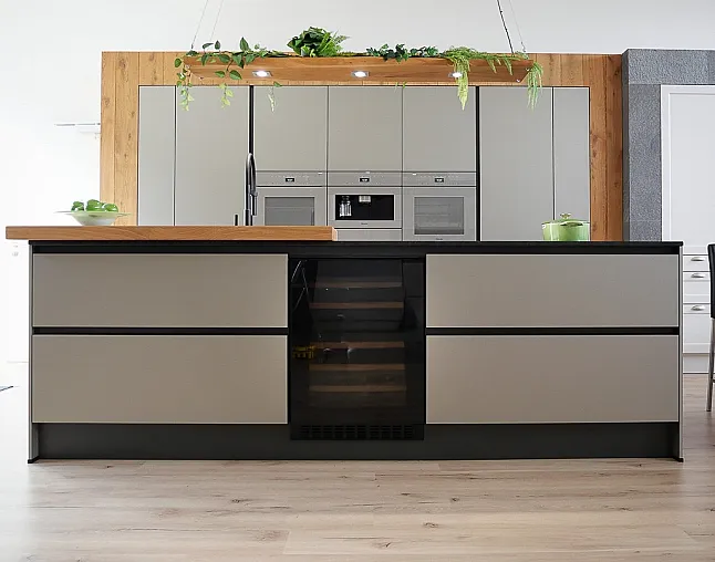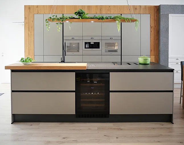 Schüller LUXUS IN TAUPE | NERO | EICHE | GERÄTE in PEARLBEIGE. Verwöhnen bis ins Detail: Edle HighTech-Fronten "Taupe Metallic Matt" harmonieren faszinierend mit neuestem Gerätefarbton "PEARLBEIGE", Naturstein "Nero Zimbabwe flamed & brushed" und Eiche Natur XXL-Combidampfgarer mit Selbstwasch-Automatik. Backofen mit Kernthermometer, Klimagaren & Pyrolyse. Kaffeeautomat. Wärmeschublade. Induktion mit Muldenlüfter & Top-Filtertechnik. XL-Kühlschrank mit Frischeschubladen & NoFrost-Gefrierer.2-Zonen-Weinkühler!