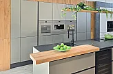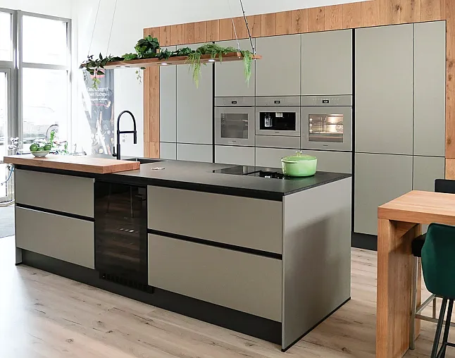 - Wir wollten mit dieser Küche auch optisch mal ein neues Ausrufezeichen setzen nach dem - abflauenden - Trend weißer (zunächst glänzender, dann matter) Küchen und neben den auch bei uns extrem gefragten anthrazitfarbenen Küchen, die sich längst als zeitlos etabliert und Weiß quasi abgelöst haben. Jahrelang haben wir gewartet, ob nicht mal ein neues Frontmaterial und/oder sogar ein neuer Farbton eingeführt wird, dem wir zutrauen, über einen kurzfristigen Trend hinaus der neue zeitlose Maßstab für die nächsten Jahre zu werden. Und hier ist tatsächlich beides der Fall! Erstens verfügt diese Küche über das neuartige Frontmaterial "RAUVISIO crystal" aus der Forschung von den Spezialisten von Rehau, das Schüller schlicht "Smartglas" nennt und aufgrund des unnachahmlichen Looks, der extremen Splitter- und Verzugsfestigkeit, der eleganten Kante (wie bei Glas mit einer angeschliffenen Fase, jedoch im Gegensatz zu Glas fugenlos!), der Unempfindlichkeit und der leichten Pflege zum Nachfolger von ESG-Glasfronten erkoren hat, die bisher schon unsere Lieblinge waren. Zweitens wurde hier ein spezieller Farbton aus der neuen "Deep Collection" von Rehau gewählt, den Schüller sehr treffend "Taupe Metallic Matt" nennt, denn genau so sieht er aus! Ein erdig-warmer, moderner und gemütlicher Grau-Braun-Beige-Ton, der so exakt die neuesten Einrichtungstrends trifft und dennoch bereits jetzt ein Klassiker ist - auch, weil er so extrem kombinationsfreudig ist zu Grau- und Beigetönen, zu Holz, zu Beton. Er strahlt Ruhe und Hochwertigkeit aus und ist etwas ganz besonderes - auch wegen seiner geradezu faszinierenden matten, bei Lichteinfall unfassbar edel schimmernden Oberfläche, die mit ihrer Tiefenwirkung ("deep") einzigartig ist und genau richtig die Lücke zwischen heller und dunkler Küche füllt. So ein traumhaftes Frontmaterial existierte bisher schlichtweg nicht und wir und unsere Kunden haben nur darauf gewartet und sind begeistert! Zumal obendrein die Pflegeeigenschaften besser sind als bei Lackfronten, man Fingerabdrücke weniger sieht als bei anderen unifarbenen Frontmaterialien mit ähnlichem Helligkeitsgrad, und man im Gegensatz zu den bisherigen Glasfronten nicht mit Fugen an den Kanten und mit deutlichen Verzugsproblemen leben muss - denn Rehau hat diese Fronten als komplettes System entwickelt mit schützendem Kantenmaterial, das ohne Fuge angebracht wird ("Nullfuge"), und einem auch farblich angepassten rückseitigen Material, das als sogenannter Gegenzug wirkt und die Front zu einem stabilen Gesamtverbund macht. Das ist tatsächlich HighTech an einer Stelle, an der Sie es vielleicht nicht vermutet hätten, nämlich schon beim Möbelbau!