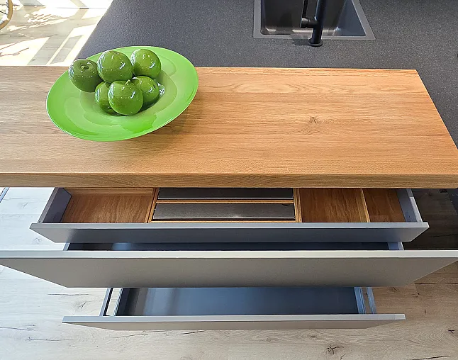 - Durchdachte und detailverliebte Planung wie für unser eigenes Zuhause statt bloßes Zusammenwürfeln von Schränken, Geräten und Zubehör, damit eine Koje in der Ausstellung gefüllt ist. Und diese Küche steht bei uns als erste direkt im Eingangsbereich und muss natürlich erst recht etwas ganz besonderes sein! Für diese Küche haben wir uns daher neue Planungsideen einfallen lassen und auch keine Kosten für Sonderanfertigungen gescheut. Das geht so weit, dass hier nicht nur teure Sonderanfertigungen für einige Korpusse, Schubladen, Auszüge und Fronten eingeflossen sind und die Theke - wie bei uns üblich - eigens von einer Tischlerei für uns angefertigt wurde, sondern dass diese Küche erstmals sogar nach unseren eigenen Entwürfen und Vorgaben maßgefertigte Eiche-Besteckeinsätze enthält, die Sie mit dieser durchdachten Aufteilung, praktischen Ausstattung und hochwertigen Ausführung für diese Schubladenmaße nirgendwo sonst finden werden. Denn wir wollten mal zeigen, dass wir ein ganz besonderes Inselmaß anbieten können, dass für viele unserer Kunden ein "Problemlöser" ist, weil es die Lücke zwischen mittelgroßer und sehr großer Insel schließt: Es bietet entscheidend mehr Arbeitsfläche und Stauraum als mittelgroße Inseln - und macht mehr Luxus bei der praktischen und technischen Ausstattung möglich, der vorher ausufernden Inseln vorbehalten blieb. Und es wirkt auch optisch natürlich beeindruckender als kleinere Inseln, ohne etwas wuchtiges an sich zu haben. Diese Sondermaße haben sich bei unseren Kunden als die Lösung herausgestellt für diejenigen, denen eine mittelgroße Insel zu wenig bietet und die in der Länge und Tiefe keine sehr große Insel stellen können oder wollen - weil der Raum es nicht hergibt oder sie einfach etwas mehr Luftigkeit drumherum haben möchten. Der neue XL-Kühlschrank in der Hochschrankwand verschenkt übrigens genauso wenig Platz wie die raffinierte Inselplanung, und auch auf eine solch naheliegende Lösung haben unsere Kunden und wir lange gewartet, nämlich oben nicht Platz für ein unnützes Möbelfach zu verschenken. Zwar haben wir schon mal den kurzen Zweifel gehört: "Komme ich da überhaupt gut dran?". Aber sollte man deswegen auf Platz im Kühlschrank verzichten, den man bekanntlich nie genug haben kann? Denn ein bei einem kleineren Kühlschrank wäre das oberste Fach ja nur deswegen besser zu erreichen, weil oben einfach ein Stück Kühlschrank und somit die oberste Ablageebene fehlt. Und so sah auch dieser Kunde sofort ein, dass der zusätzliche Platz im Grunde ein Geschenk ist und er ihn gerne nimmt und für das Kühlen von Dingen nutzt, an die er nicht mehrmals am Tag heran muss. Und noch eine pfiffige neuartige Lösung, von der alle begeistert sind, gibt es in der Hochschrankwand dieser Küche: ein ausziehbares Tablar mit leicht abwischbarer Glasoberfläche, das sich perfekt für die Unterbringung von Geräten wie z.B. Küchenmaschine und/oder Toaster eignet, weil es gleich drei eingebaute Steckdosen mitbringt und im herausgezogenen Zustand stabil arretiert und so quasi einen halben Meter zusätzliche Arbeitsfläche darstellt, die schön aufgeräumt im Hochschrank versteckt ist und sich einfach bei Bedarf hervorzaubern lässt ;-)