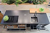 - Begeistert sein werden Sie auch von weiteren Ausstattungsdetails dieser Küche. Der für die Arbeitsplatte verwendete Naturstein aus Zimbabwe gehört zur "Gabbro" genannten Gattung sehr harter und dichter Natursteine und entfaltet mit der hier gewählten und sehr aufwändigen Oberflächenbearbeitung "geflammt und gebürstet", die ihn obendrein besonders unempfindlich macht, eine geradezu monumentale Wirkung. Über seine Vorteile gegenüber häufig für Arbeitsplatten verwendeten Graniten könnte man einen eigenen Aufsatz schreiben, der hier den Rahmen sprengen würde. Besser als die italienischen Experten von "Marmi Rossi Spa" könnten wir es ohnehin nicht beschreiben, daher empfehlen wir Ihnen, mal deren deutschsprachigen Artikel "Der Nero Zimbabwe ist eigentlich kein Granit, sondern ein Gabbro" zu googeln... Während die dunkle anthrazitschwarze Grundfarbe des Steins, zusammen mit den lavaschwarzen Schränken, Griffmulden und Sockelleisten einen wunderschönen Kontrast zu den Fronten der Schränke und der Geräte bildet, passen die in den dunklen Stein eingeschlossenen helleren Kristalle von Ihrer gräulichen Farbe und ihrem leicht grau-bräunlich angehauchten Schimmer, der besonders an der geschliffenen Kante der Arbeitsplatte zum Vorschein kommt, verblüffend gut zu dem Farbton der Schrank- und Gerätefronten! Wer sich an solchen Details so erfreuen kann wie wir, wird auch Freude haben an weiteren schön gemachten und praktischen Ausstattungsdetails wie den flexibel zwischen den drei größten Besteckeinsätzen austauschbaren 3 Zusatzmodulen (1x Halter für 12 Gewürzdosen, 1x Folienabroller mit 2 Fächern und in die Edelstahldeckel gelaserten Abrisszähnen für die Folie, 1x integrierter Messerblock für große Kochmesser), mittig in die Inselplatte eingelassener und verschließbarer Doppelsteckdose, Handtuchhalter im Schrank links neben der Spüle, schöner schwarzer Armatur mit praktischem schwenk- und biegbaren Brauseschlauch, auf Maß und ohne nutzlose und optisch störende Ausgleichsblenden gefertigte Tip-On-Türen ober- und unterhalb der nebeneinander angeordneten Miele-Geräte, verdeckt integrierte Zuluftführung für das Kühlzentrum ohne ebenso optisch störendes Lüftungsgitter im Sockel, Mülltrennsystem für 3 Sorten mit Front-Vollauszug direkt unter der Spüle, usw. ... Zum in die Berbel Muldenlüftung integrierten Induktionskochfeld mit praktischen Eigenschaften wie abrufbaren Temperaturstufen zum Schmelzen, Warmhalten und Fortkochen passt perfekt die darauf abgestimmte, extra große Teppanyaki/Plancha Brat- und Grillplatte (siehe großes Kochfeld-Foto und Einzelfoto), die vom Kochfeld automatisch erkannt wird, so dass hier z.B. perfekt Steaks und Gemüse gegrillt werden können. Wir haben sehr lange nach so einer perfekt abgestimmten Teppanyaki-Platte gesucht und liefern dieses kleine und bei unseren Kunden sehr beliebte Schmankerl daher gleich mit!