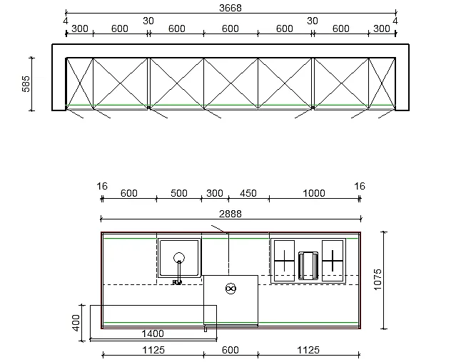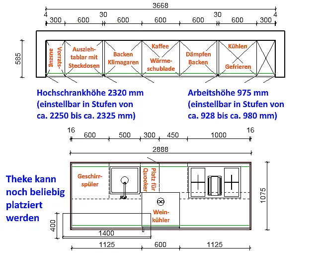 Die Hochschrankwand ist 3,66 m lang und 2,32 m hoch, wobei die Höhe noch auf einige Werte zwischen ca. 2,25 und 2,33 m eingestellt werden kann. In der Länge kann Sie auf Wunsch auch anders angeordnet oder sogar aufgeteilt werden, dabei wären lediglich folgende Hinweise zu beachten: