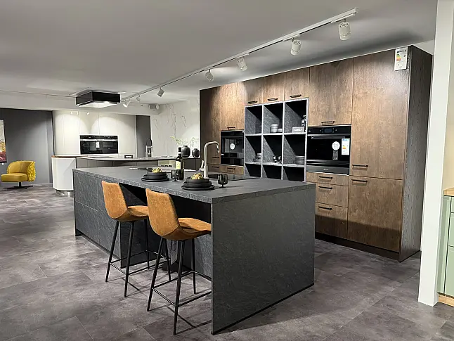 Entdecken Sie die Inselküche, die modernes Design, natürliche Materialien und durchdachte Funktionalität in Perfektion vereint. Die Kombination aus Alvaro Schiefer Nachbildung und edlem Asteiche Maron Furnier verleiht Ihrer Küche eine außergewöhnlich stilvolle Ausstrahlung – modern, zeitlos und dennoch warm. Die hochwertige Schieferoptik sorgt in Verbindung mit robusten, pflegeleichten Oberflächen für Langlebigkeit und Alltagstauglichkeit. Das charaktervolle Furnier bringt natürliche Eleganz ins Spiel und macht aus der Küche mehr als nur einen funktionalen Raum: Sie wird zum kommunikativen Zentrum Ihres Zuhauses. Ob beim gemeinsamen Kochen oder genussvollen Zusammensein – diese Inselküche begeistert anspruchsvolle Genießer mit Qualität, Komfort und Ästhetik, die man sieht und spürt.