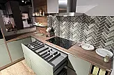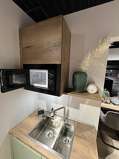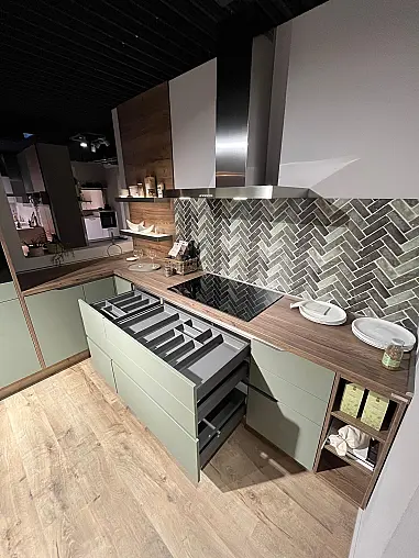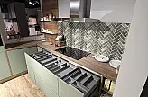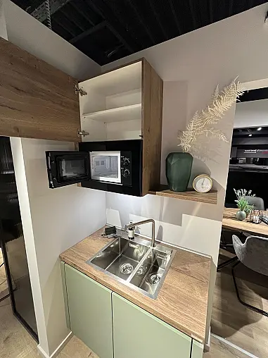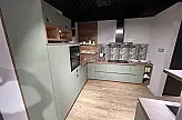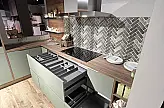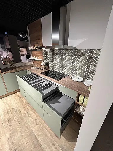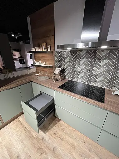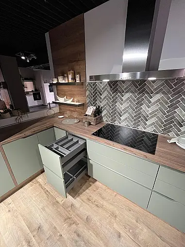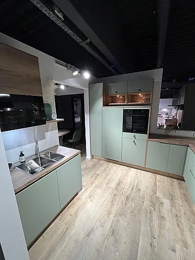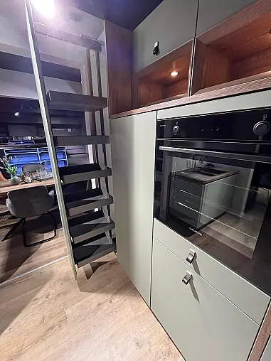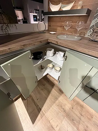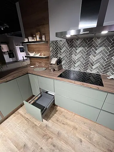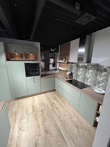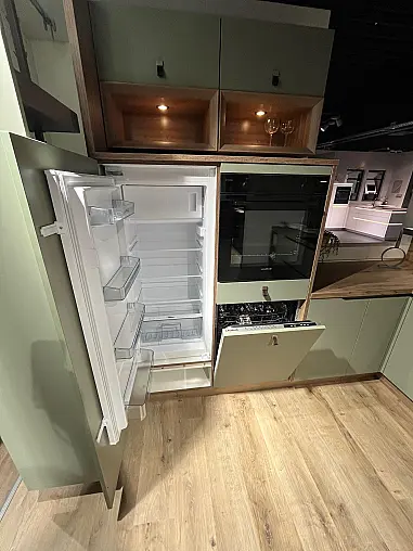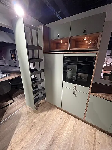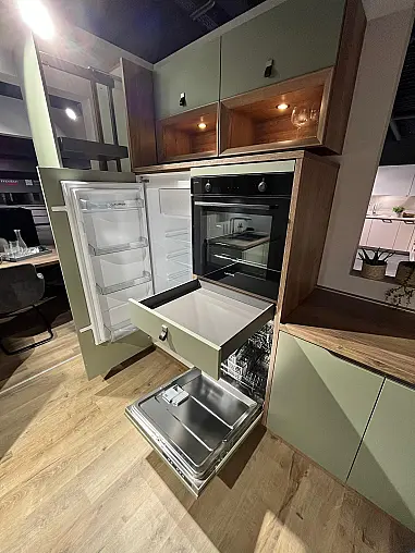 Nobilia Senso Lack Olive premium matt und Structura Eiche Havanna NB Exklusive Messeküche - Lackfront - Grifflos - LED-Beleuchtungen - Rückwandverkleidungen