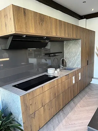 Diese grifflose Küchenzeile besticht durch ihre atemberaubende Kombination aus Holz und Keramik. Die hochwertigen furnierten Fronten harmonieren perfekt mit der eleganten Keramik-Arbeitsplatte im Steindekor und verleihen Ihrer Küche eine stilvolle und warme Atmosphäre. Planen Sie individuell und passen Sie die Küche Ihren Bedürfnissen an – ob als komplette Renovierung oder modernes Upgrade.