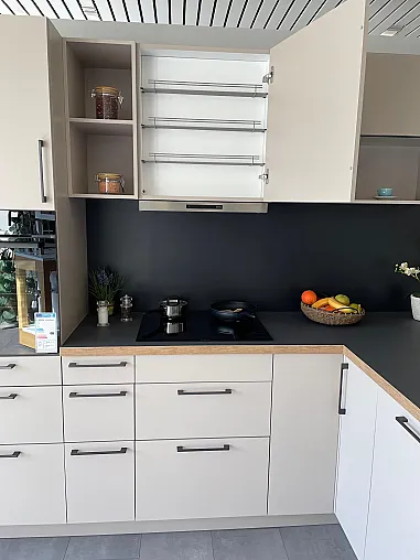 Erleben Sie die einzigartige Kombination aus gemütlichem Charme und zeitloser Eleganz mit der Häcker Musterküche Top Soft Kashmir. Diese L-förmige Küche in hellem, unifarbenem Mattlack strahlt eine warme Atmosphäre aus und fügt sich harmonisch in jeden Wohnraum ein.