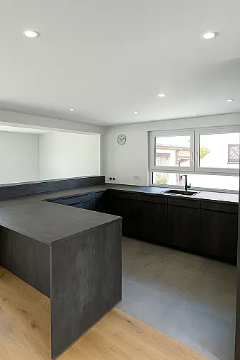 Die Küche überzeugt in einer U- oder G-Form mit großzügiger Inselanlage und integrierter Theke, das Frontdekor in Comet Spachtelbeton Schwarz verleiht Ihrem Raum einen zeitgemäßen Charme. Dank umplanbarer Elemente passen Sie die Gestaltung individuell an Ihre Bedürfnisse an.