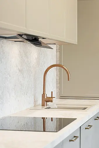 Diese stilvolle Küche vereint klassische Eleganz mit moderner Funktionalität. Die Fronten in Umbra-natur matt schaffen eine warme, zeitlose Atmosphäre, während die hellen Arbeitsplatten in Steinoptik für ein harmonisches Gesamtbild sorgen. Hochwertige Messinggriffe setzen edle Akzente und runden das Design perfekt ab.